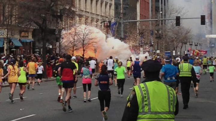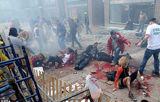 Vítimas dos atentados da Maratona de Boston estão no chão imediatamente após as explosões.